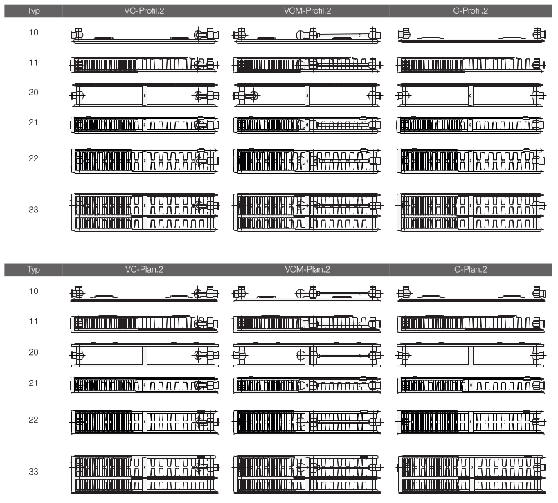 Die Heizkörper sind in Höhen von 300 bis 900 mm und Längen von 400 bis 3000 mm erhältlich. Verschiedene Typen (10, 11, 20, 21, 22, 30, 33) mit unterschiedlicher Plattenanzahl und Konvektionskanälen ermöglichen die exakte Abstimmung auf Ihren Wärmebedarf. Ob Ventil-Kompaktausführung (VC), Variante mit Mittenanschluss (VCM) oder klassische Kompaktausführung (C) – für jede Einbausituation gibt es die passende Lösung. Genauere Information entnehmen Sie bitten dem verfügbarem PDF-Dokument.